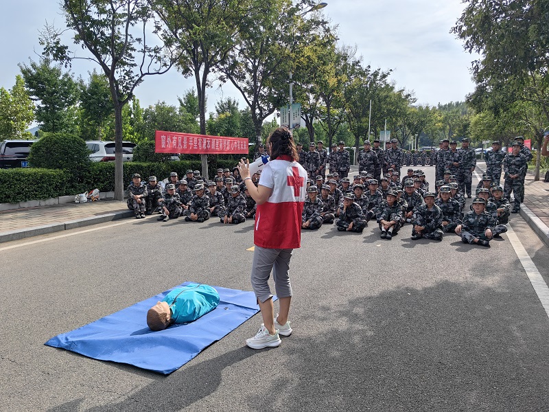 市红十字会的志愿者们通过模拟演练的方式为参加军训的新生普及了心肺复苏术、海姆立克技法和AED(心脏体外除颤器)使用方法。