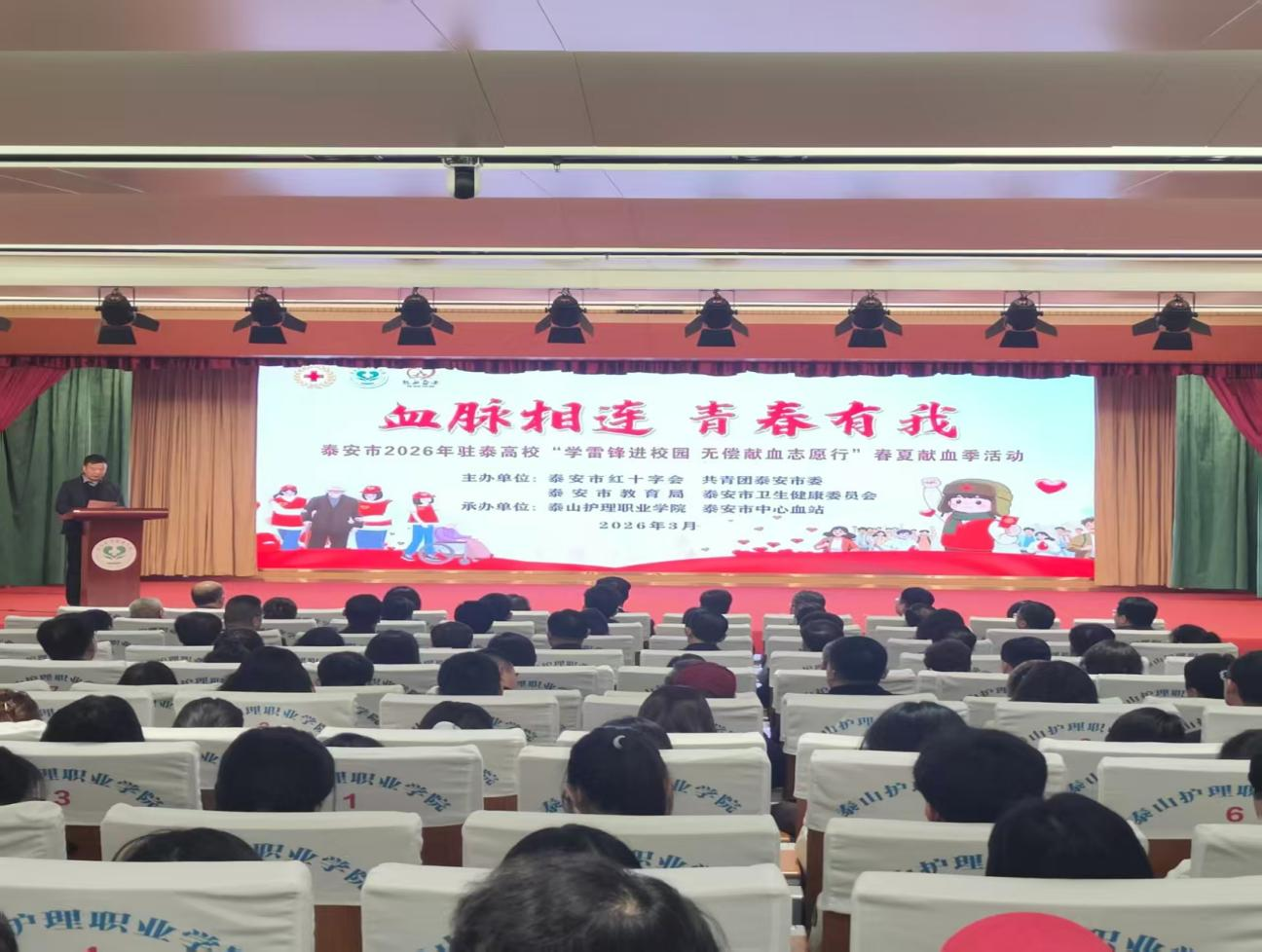 为深入贯彻落实省红十字会、团省委、省教育厅、省卫生健康委关于第二届“学雷锋进校园 无偿献血志愿行”活动部署要求,大力弘扬新时代雷锋精神与红十字精神,3月25日,泰安市2026年驻泰高校“学雷锋进校园 无偿献血志愿行”春夏献血季活动在泰山护理职业学院隆重举行。